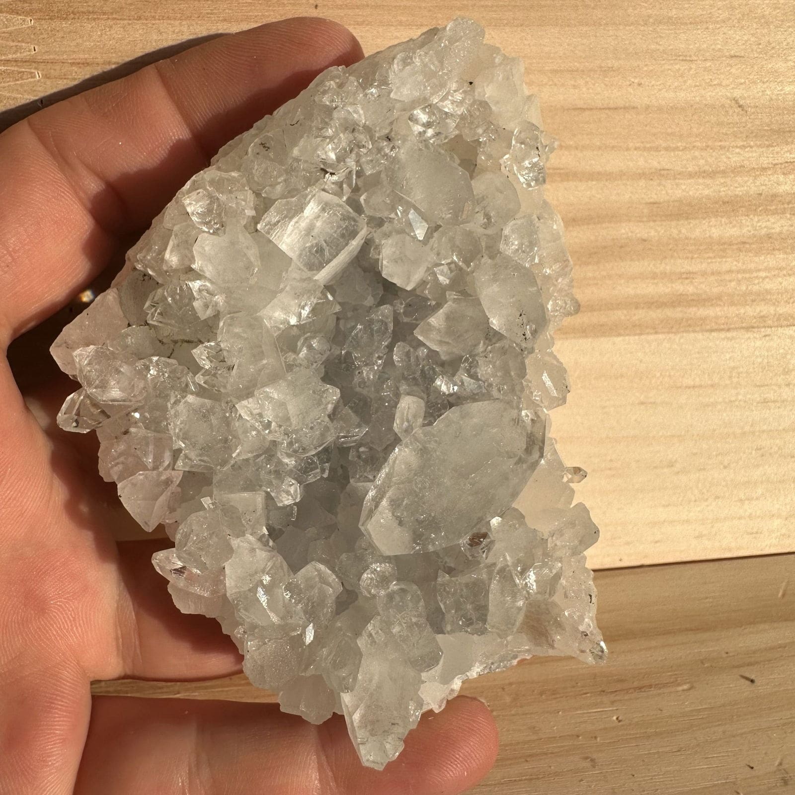 Elk stuk uit deze partij bevat Apofyliet en kan daarnaast ook Kwarts, Albiet, Gyroliet, Stilbiet, Chalcedoon, Heulandiet en Mesoliet bevatten. Je ontvangt precies het exemplaar dat op de foto’s wordt afgebeeld.