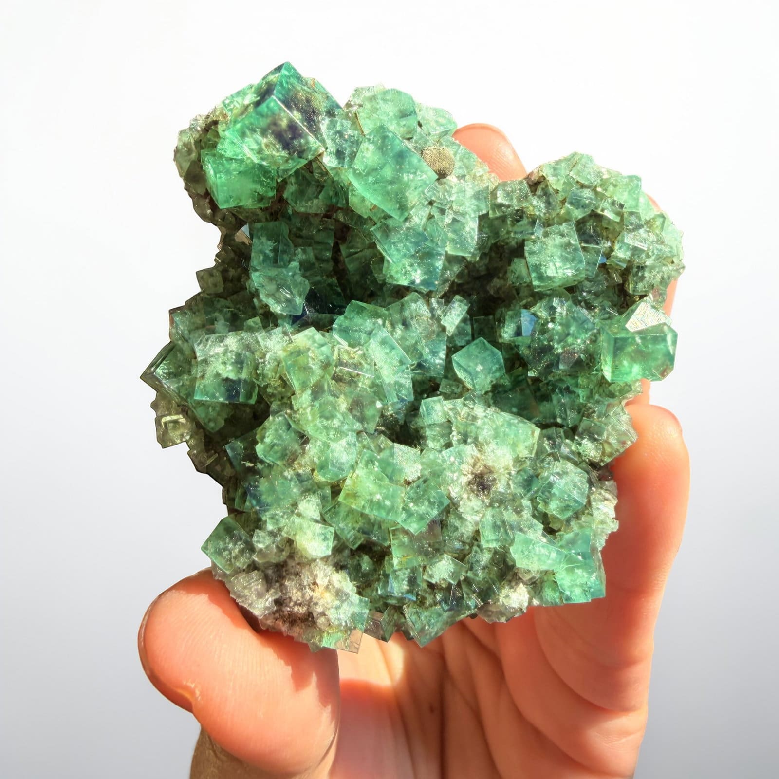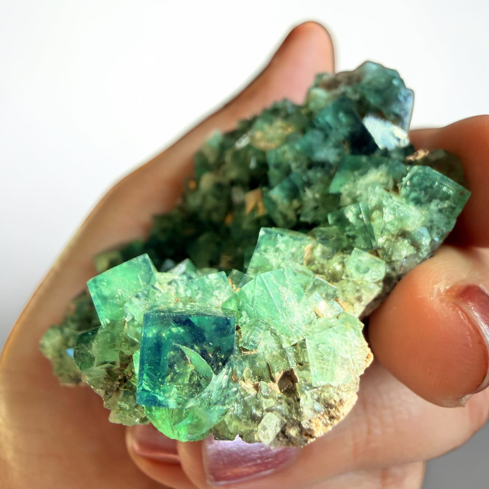 Wat deze fluoriet extra bijzonder maakt, is de manier waarop hij reageert op licht. In normaal kunstlicht zie je meestal een helder tot diep groen kristalcluster met prachtige transparantie en duidelijke groeivlakken. Maar zodra je het stuk in natuurlijk daglicht houdt, verandert de uitstraling zichtbaar. Veel Weardale fluorieten vertonen namelijk een zeldzame eigenschap die daylight fluorescence wordt genoemd. Het kristal reageert op het ultraviolet component dat van nature in zonlicht zit, waardoor er een violetblauwe gloed over het groen kan verschijnen. Daardoor lijkt de kleur letterlijk te verschuiven wanneer je het stuk van binnenlicht naar daglicht beweegt.