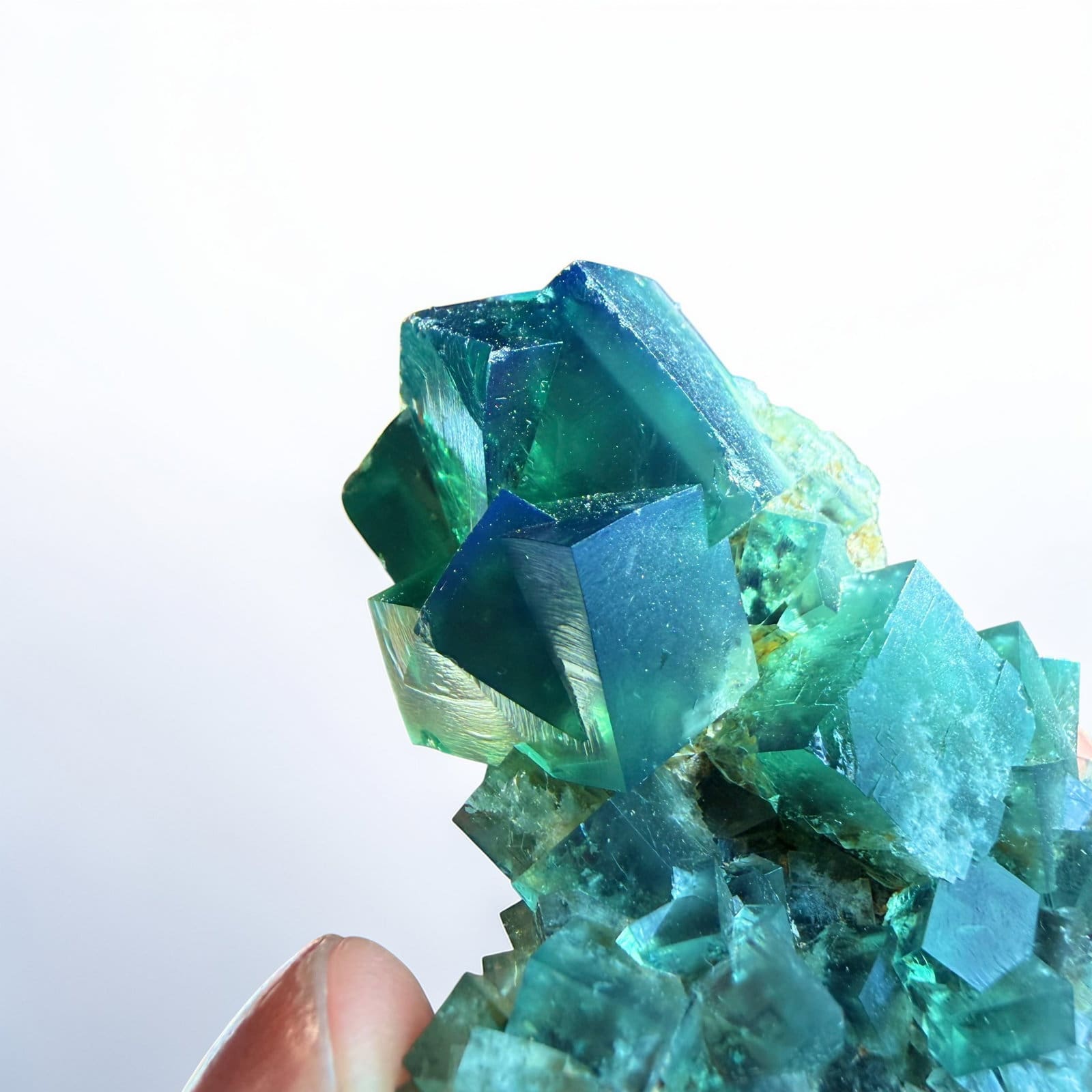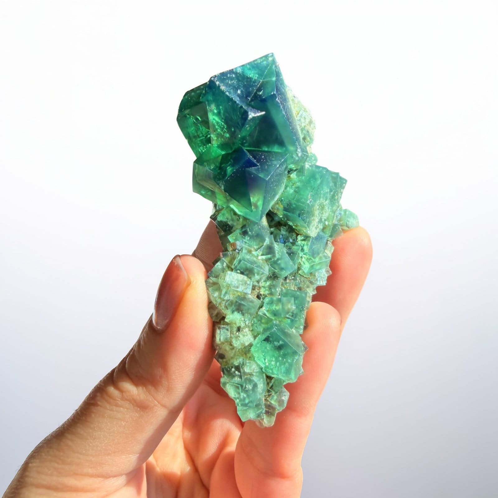Wat deze fluoriet extra bijzonder maakt, is de manier waarop hij reageert op licht. In normaal kunstlicht zie je meestal een helder tot diep groen kristalcluster met prachtige transparantie en duidelijke groeivlakken. Maar zodra je het stuk in natuurlijk daglicht houdt, verandert de uitstraling zichtbaar. Veel Weardale fluorieten vertonen namelijk een zeldzame eigenschap die daylight fluorescence wordt genoemd. Het kristal reageert op het ultraviolet component dat van nature in zonlicht zit, waardoor er een violetblauwe gloed over het groen kan verschijnen. Daardoor lijkt de kleur letterlijk te verschuiven wanneer je het stuk van binnenlicht naar daglicht beweegt.