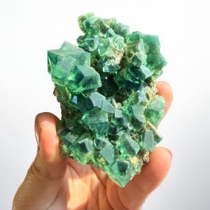 Wat deze fluoriet extra bijzonder maakt, is de manier waarop hij reageert op licht. In normaal kunstlicht zie je meestal een helder tot diep groen kristalcluster met prachtige transparantie en duidelijke groeivlakken. Maar zodra je het stuk in natuurlijk daglicht houdt, verandert de uitstraling zichtbaar. Veel Weardale fluorieten vertonen namelijk een zeldzame eigenschap die daylight fluorescence wordt genoemd. Het kristal reageert op het ultraviolet component dat van nature in zonlicht zit, waardoor er een violetblauwe gloed over het groen kan verschijnen. Daardoor lijkt de kleur letterlijk te verschuiven wanneer je het stuk van binnenlicht naar daglicht beweegt.