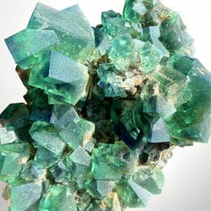 Fluoriet uit Weardale in Noord Engeland behoort al decennialang tot de meest geliefde fluorieten onder verzamelaars. Dit stuk komt uit de Diana Maria Mine, een kleine ondergrondse mijn in het gebied van Rogerley Quarry in County Durham. Hier wordt fluoriet gewonnen uit natuurlijke breuken en holtes in het gesteente. In deze open ruimtes krijgen de kristallen de kans om vrij te groeien, waardoor de typische scherpe kubussen ontstaan waar Weardale zo bekend om staat. Vaak groeien de kristallen dicht op elkaar tot compacte clusters met een glasachtige glans en een intens groene kleur.