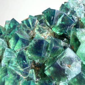 Fluoriet uit Weardale in Noord Engeland behoort al decennialang tot de meest geliefde fluorieten onder verzamelaars. Dit stuk komt uit de Diana Maria Mine, een kleine ondergrondse mijn in het gebied van Rogerley Quarry in County Durham. Hier wordt fluoriet gewonnen uit natuurlijke breuken en holtes in het gesteente. In deze open ruimtes krijgen de kristallen de kans om vrij te groeien, waardoor de typische scherpe kubussen ontstaan waar Weardale zo bekend om staat. Vaak groeien de kristallen dicht op elkaar tot compacte clusters met een glasachtige glans en een intens groene kleur.