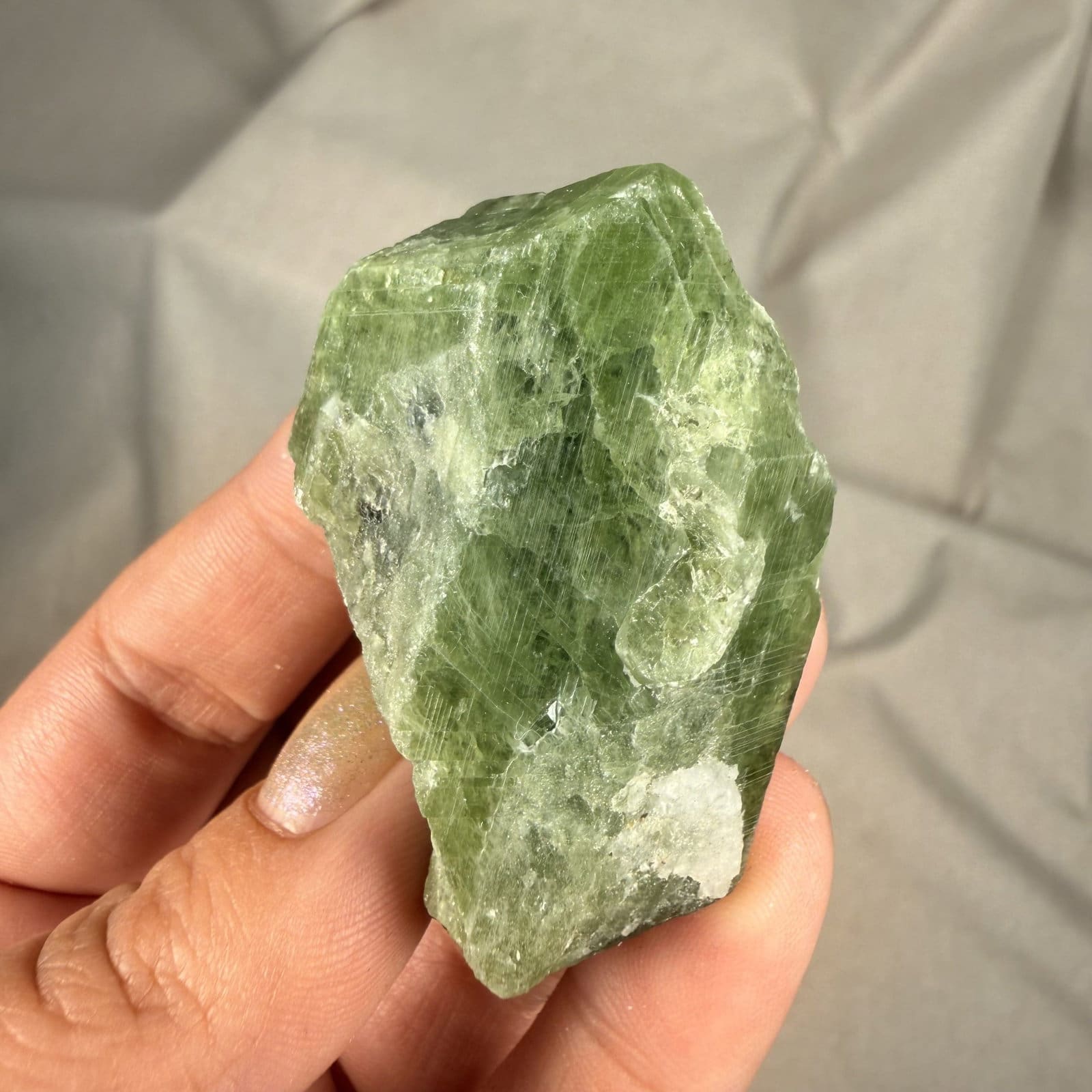 Deze groene diopside stukken komen uit Pakistan. Diopside is een pyroxeen die ontstaat in metamorfe gesteenten, wanneer kalksteen onder hoge druk en temperatuur verandert. Tijdens dit proces kristalliseren de mineralen en ontstaan de kenmerkende groene tinten waar diopside om bekendstaat.