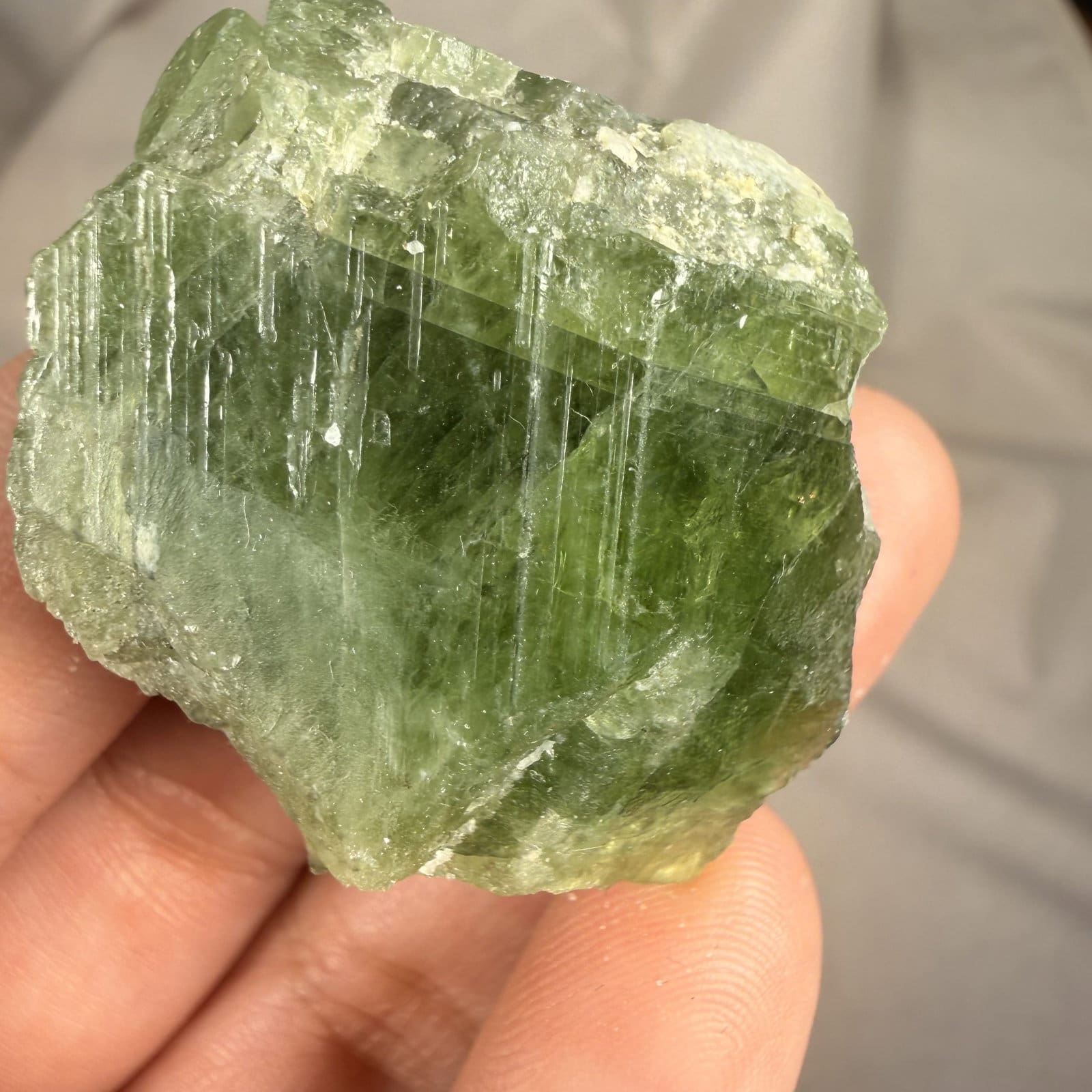 De kleur varieert in verschillende tinten groen, wat wordt veroorzaakt door natuurlijke sporen van onder andere chroom en ijzer. De kristallen kunnen zowel compact als duidelijk gelaagd groeien, wat elk stuk een eigen uitstraling geeft.