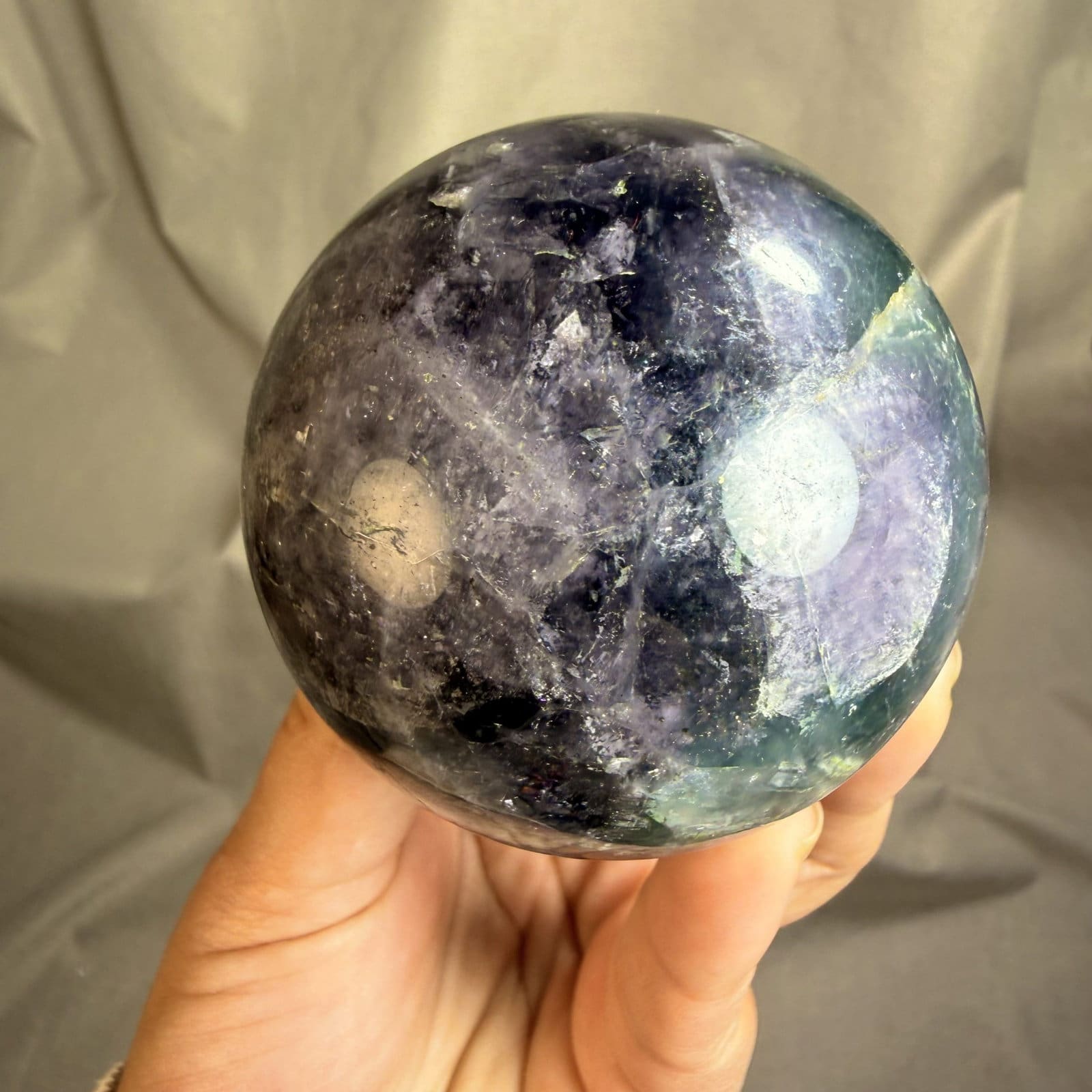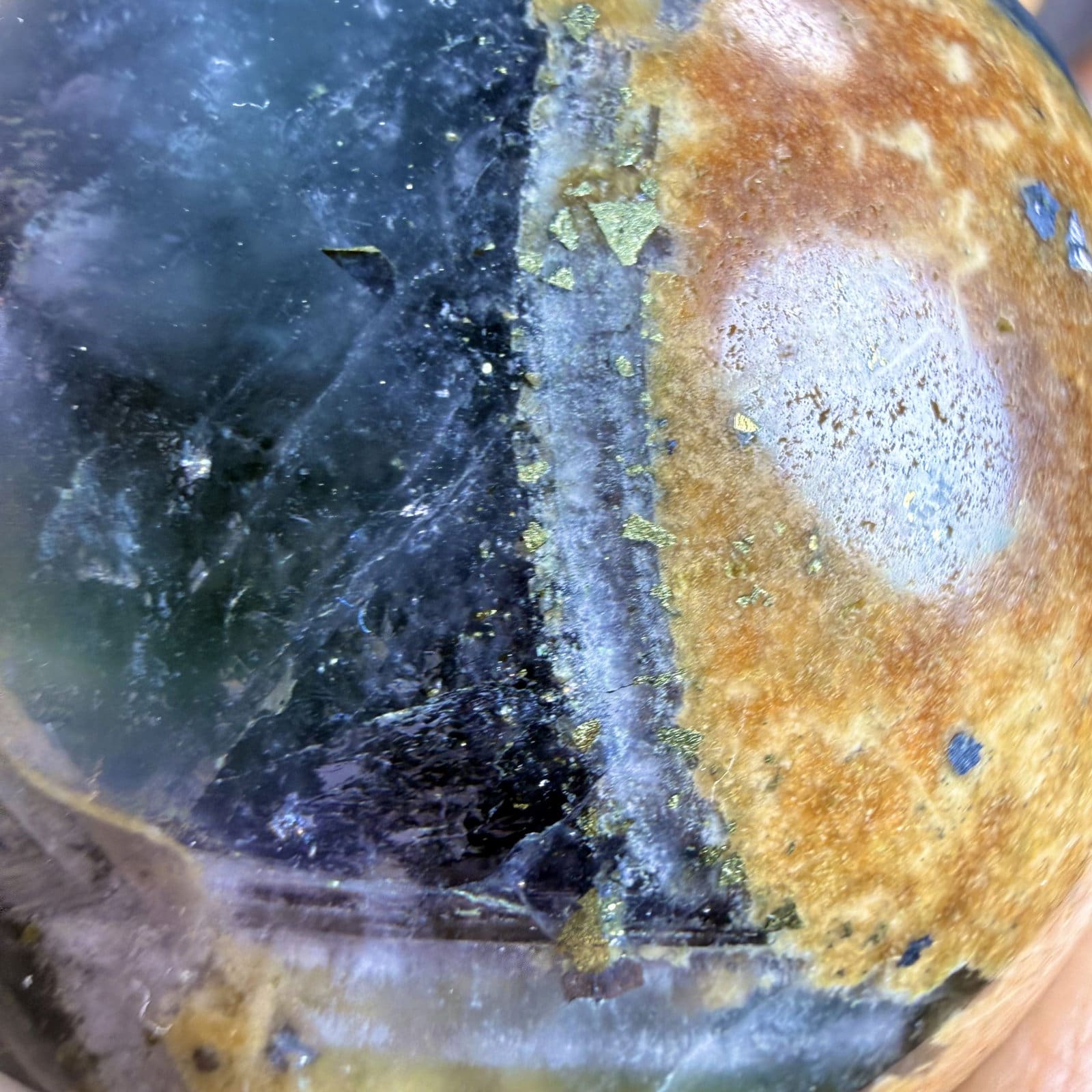 Mooie fluoriet bollen, met pyriet kristallen erin. In de handel vaak “galaxy fluoriet” genoemd. Je ontvangt het exacte stuk zoals afgebeeld op de foto’s.Â