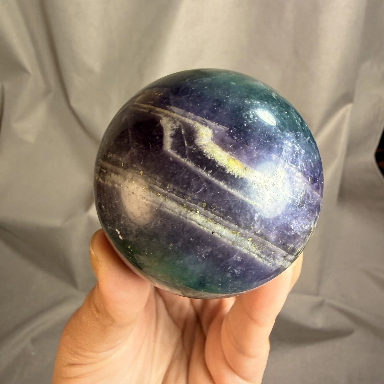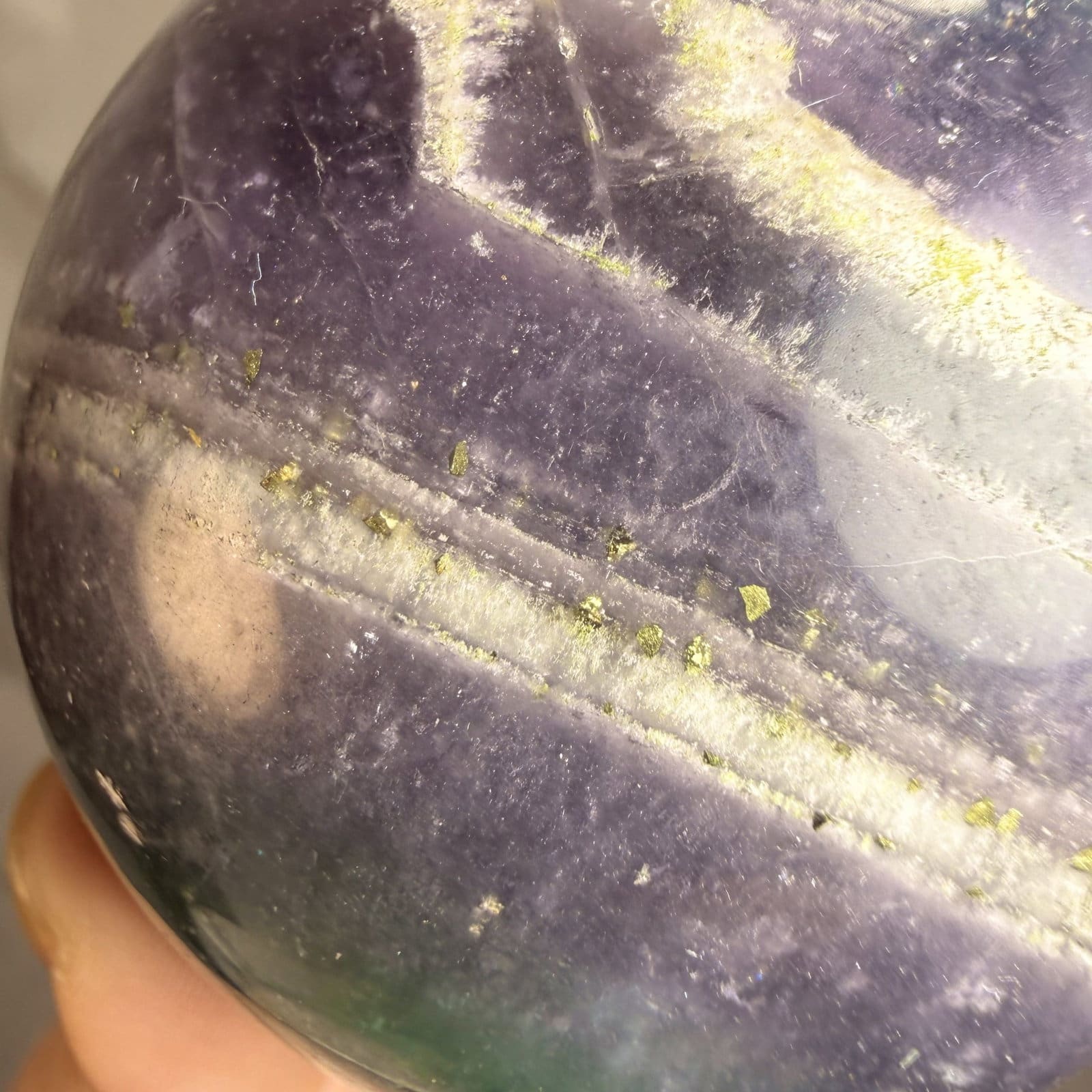 Mooie fluoriet bollen, met pyriet kristallen erin. In de handel vaak “galaxy fluoriet” genoemd. Je ontvangt het exacte stuk zoals afgebeeld op de foto’s.Â