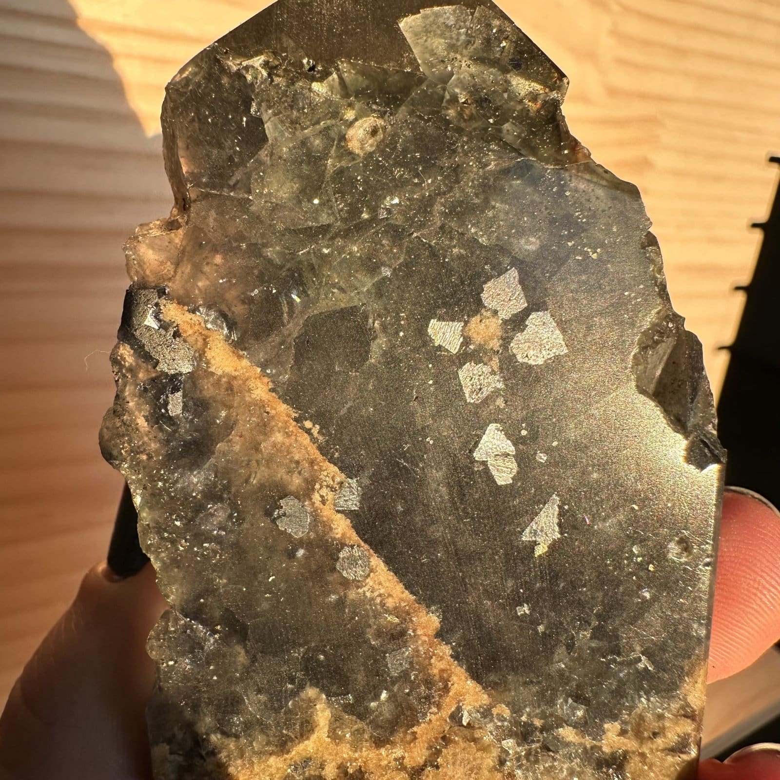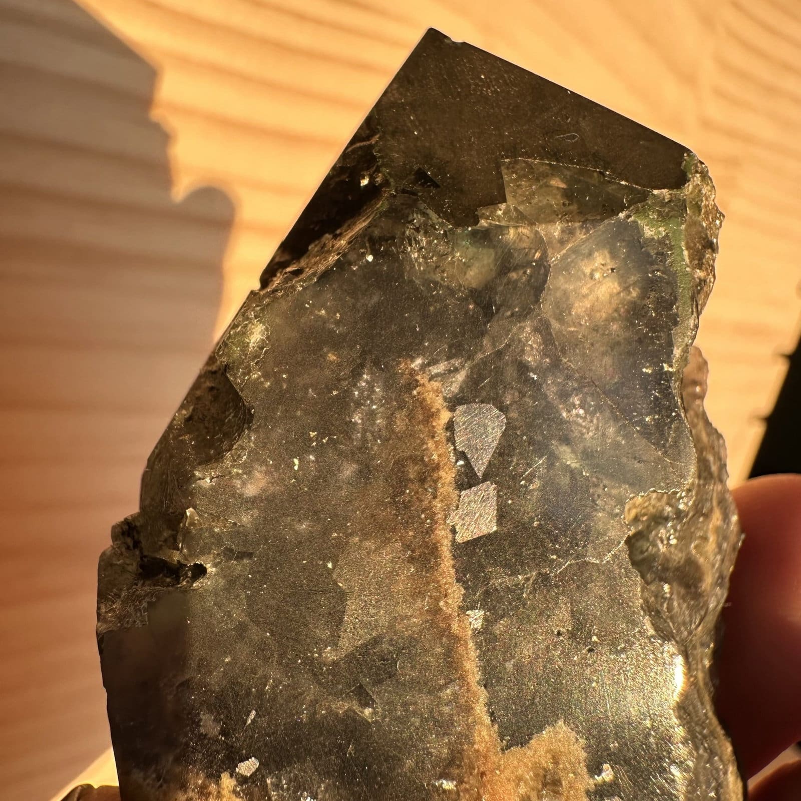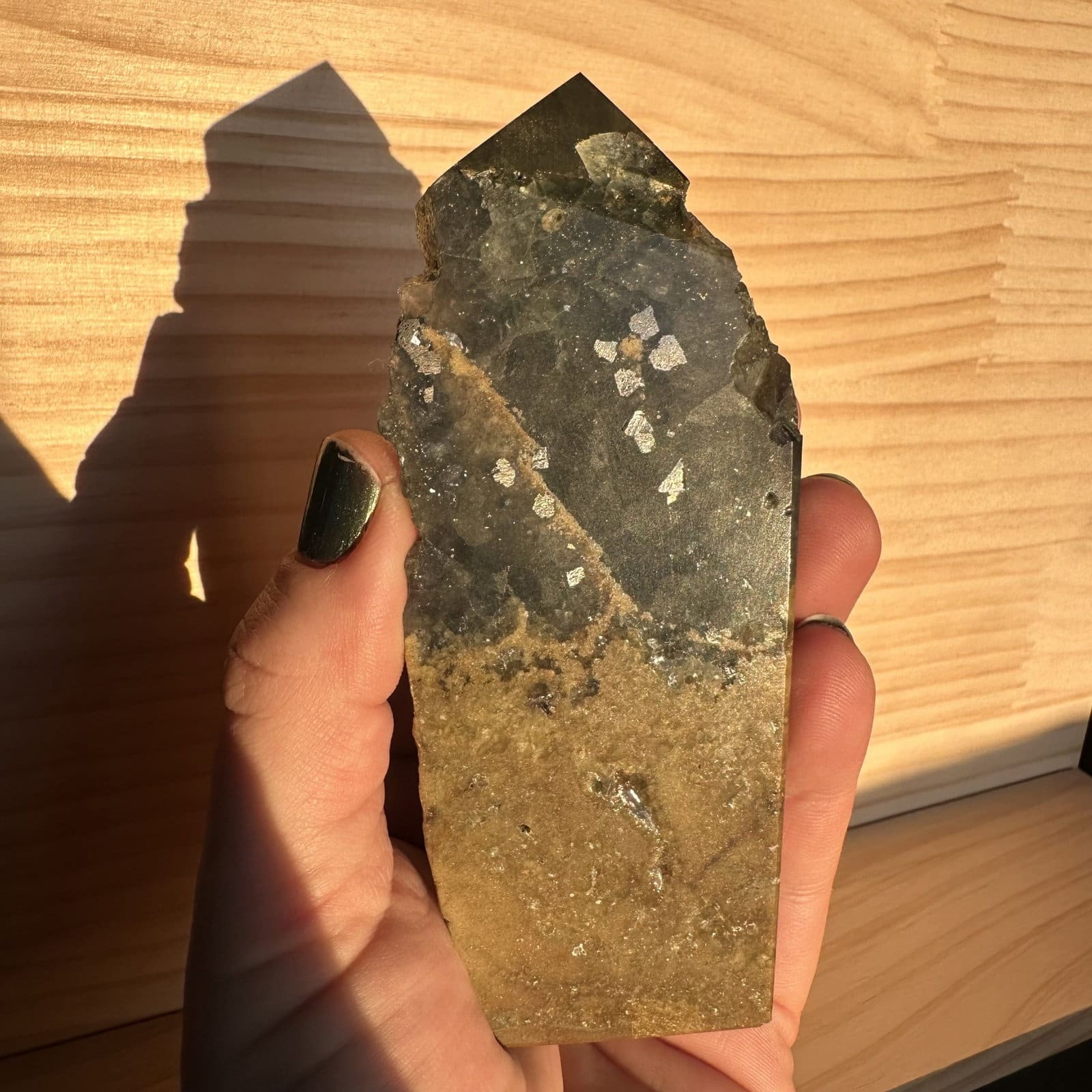 Mooie fluoriet toren, met pyriet kristallen erin. In de handel vaak “galaxy fluoriet” genoemd. Je ontvangt het exacte stuk zoals afgebeeld op de foto’s.Â