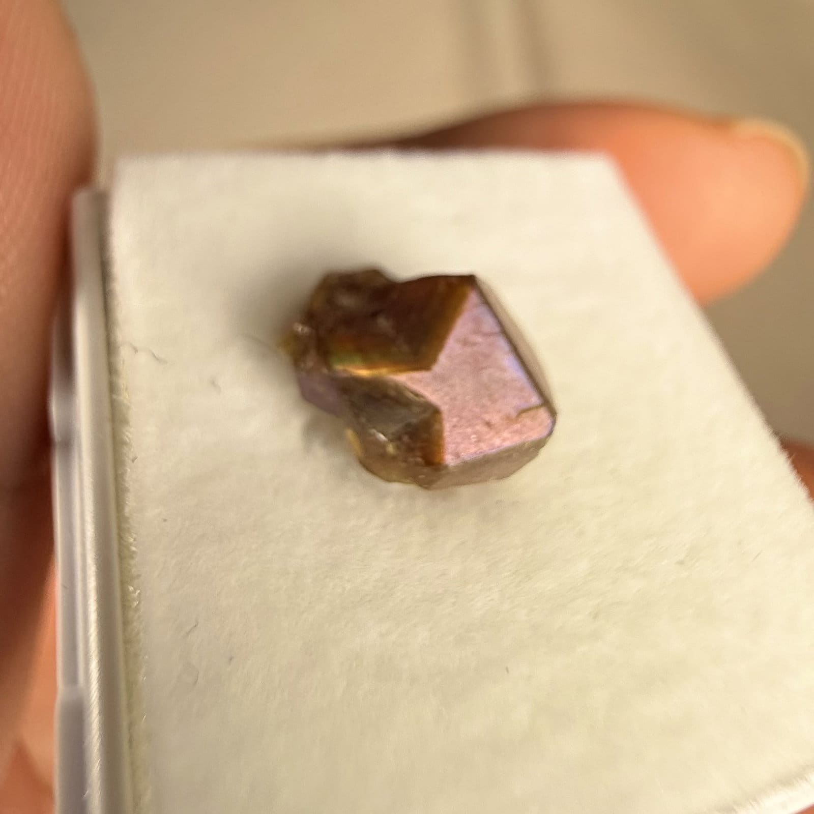 Deze extreem zeldzame andradiet uit China behoort tot de meest bijzondere varianten binnen de granaatgroep. Andradiet staat bekend om zijn hoge glans en scherpe kristalvormen, maar wat deze stukjes echt uitzonderlijk maakt, is de natuurlijke irisidentie die zichtbaar wordt wanneer het licht erover beweegt. Dit regenboogeffect is volledig natuurlijk en ontstaat door microscopisch dunne groeilagen en oppervlaktestructuren in het kristal.
