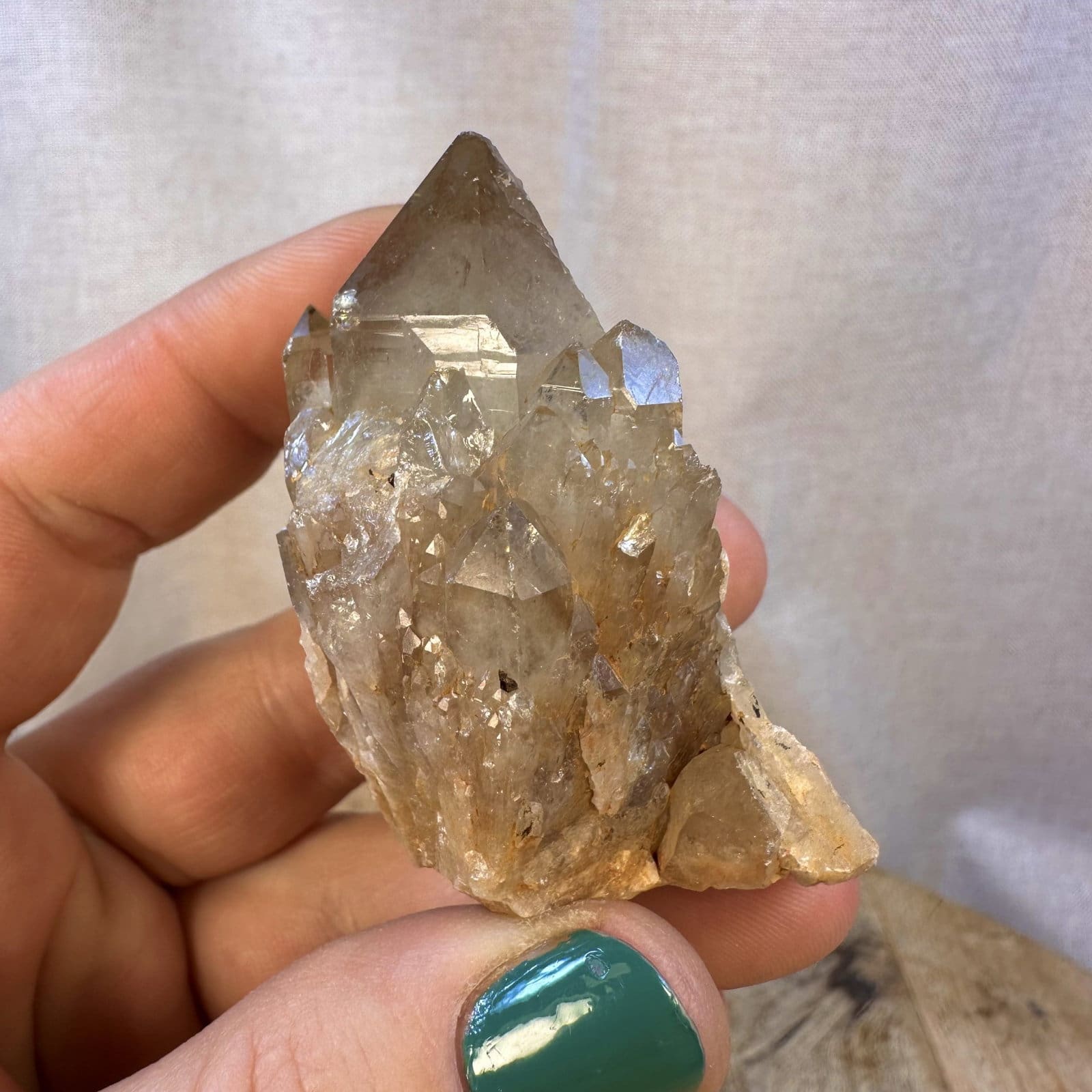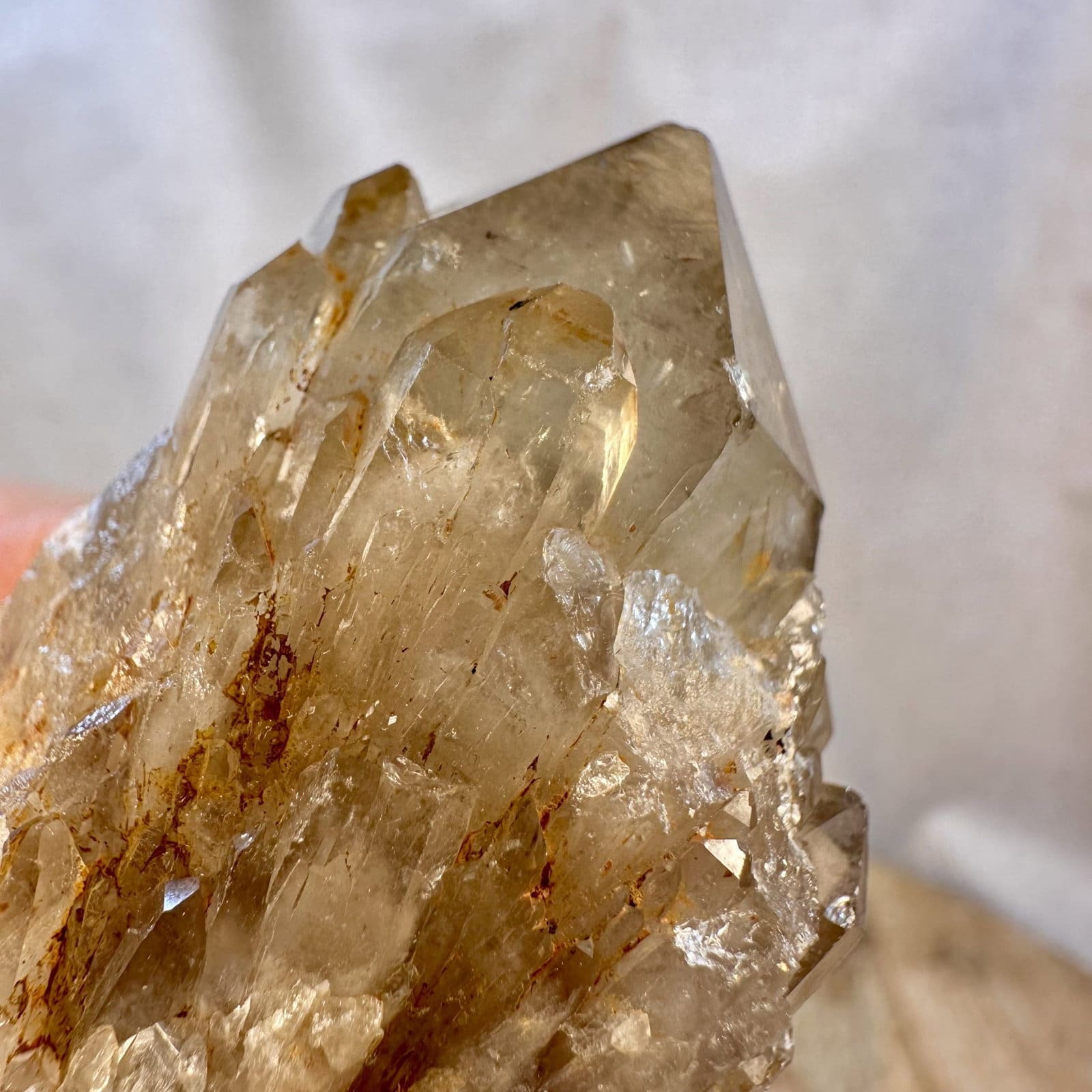 Citrien is één van de meest zeldzame kwarts varianten die er is. De mooie gouden kleur ontstaat meestal door aluminium in combinatie met natuurlijke straling. Dit proces kan wel jaren duren! De kwarts uit Lwena kenmerkt zich door de typische groei waarbij je vaak één groot kristal ziet, omringt door meerdere kleine kristallen. Omdat in Lwena de kwartsen vaak met een boor en schep uit de grond worden gehaald, zijn er weinig clusters die volledig gaaf zijn. Des te meer bijzonder is het wanneer er wel zo’n stuk tussen zit.