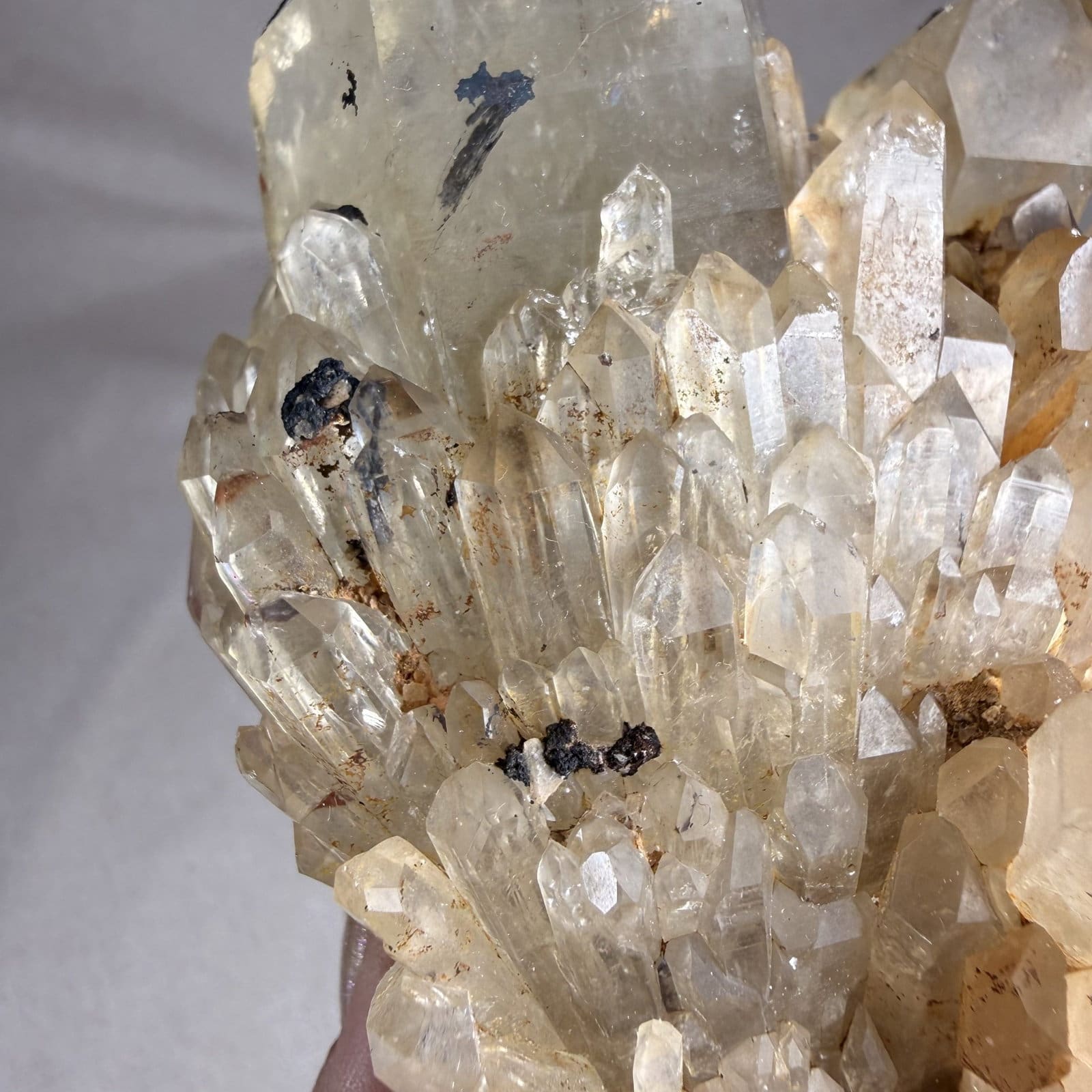 Citrien is één van de meest zeldzame kwarts varianten die er is. De mooie gouden kleur ontstaat meestal door aluminium in combinatie met natuurlijke straling. Dit proces kan wel jaren duren! De kwarts uit Lwena kenmerkt zich door de typische groei waarbij je vaak één groot kristal ziet, omringt door meerdere kleine kristallen. Omdat in Lwena de kwartsen vaak met een boor en schep uit de grond worden gehaald, zijn er weinig clusters die volledig gaaf zijn. Des te meer bijzonder is het wanneer er wel zo’n stuk tussen zit.