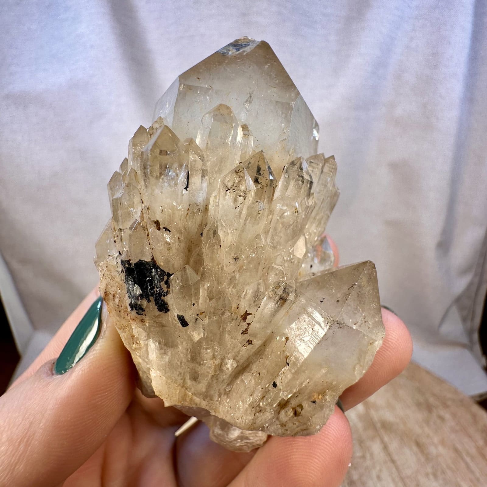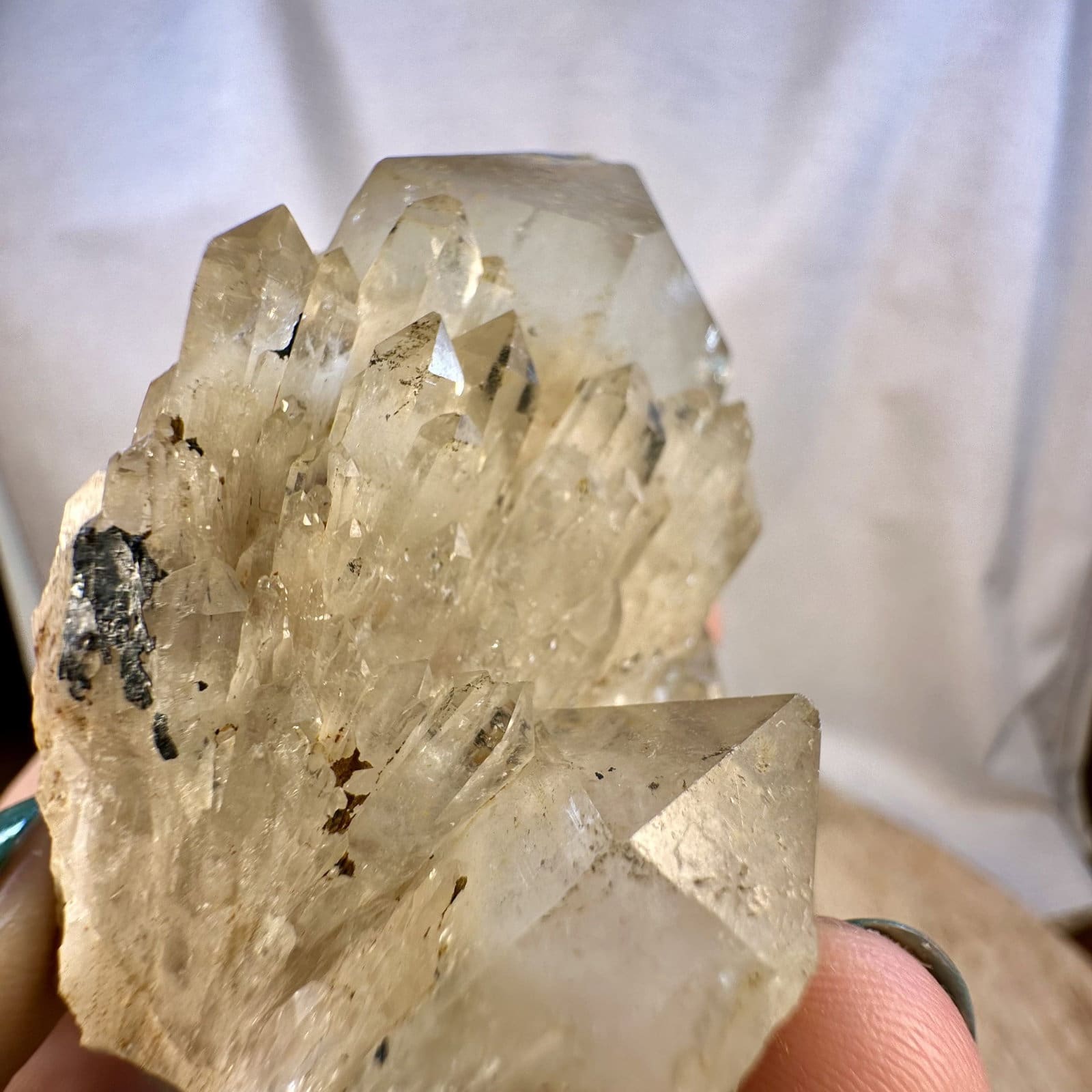 Citrien is één van de meest zeldzame kwarts varianten die er is. De mooie gouden kleur ontstaat meestal door aluminium in combinatie met natuurlijke straling. Dit proces kan wel jaren duren! De kwarts uit Lwena kenmerkt zich door de typische groei waarbij je vaak één groot kristal ziet, omringt door meerdere kleine kristallen. Omdat in Lwena de kwartsen vaak met een boor en schep uit de grond worden gehaald, zijn er weinig clusters die volledig gaaf zijn. Des te meer bijzonder is het wanneer er wel zo’n stuk tussen zit.