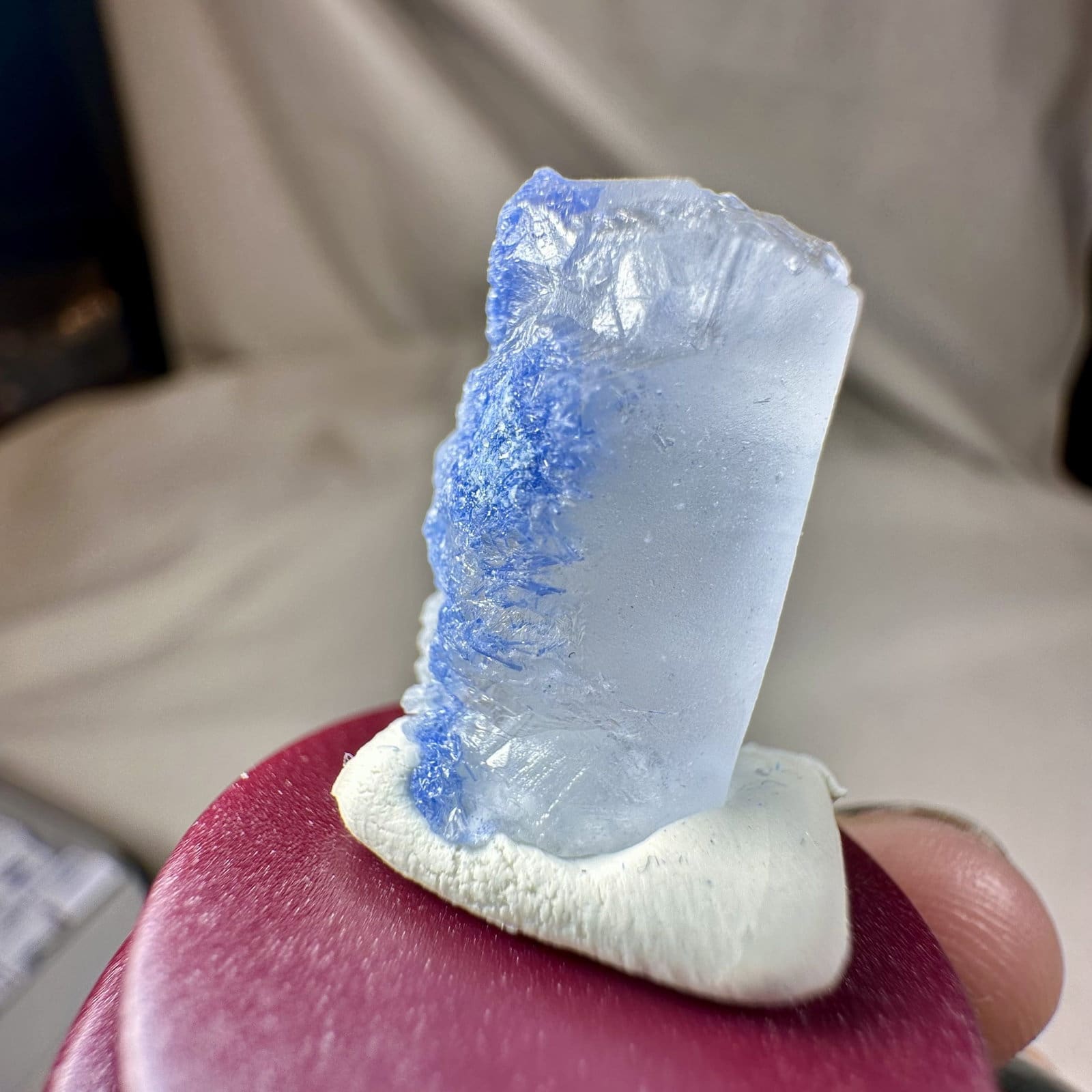 Dumortiriet is een aluminium boro silicaat en dankt zijn intense blauwe kleur aan de aanwezigheid van ijzer en borium. Tijdens de groei van het kwarts zijn de dumortirietkristallen meegegroeid en als het ware gevangen in het kristal, waardoor deze karakteristieke naaldstructuren zijn ontstaan. Dit gebeurt alleen onder specifieke omstandigheden en maakt elk stuk uniek.