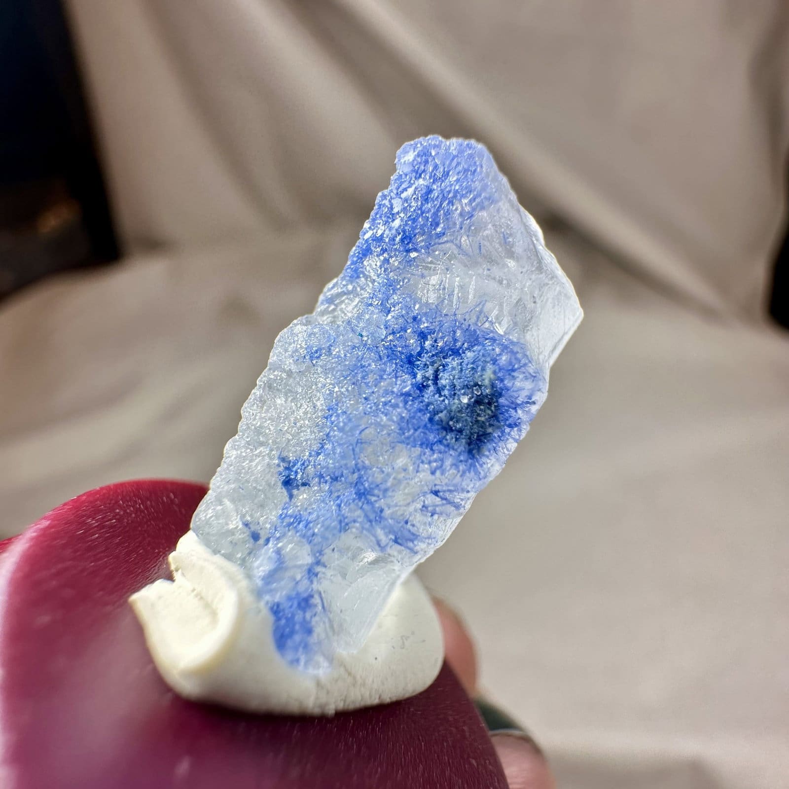 Deze naald dumortiriet in kwarts uit Bahia in Brazilië is een prachtig voorbeeld van hoe twee mineralen samen iets heel bijzonders kunnen vormen. In helder tot melkachtig kwarts lopen fijne naalden van diepblauwe dumortiriet, soms als losse vezels en soms als compacte bundels. Het contrast tussen het frisse blauw en het lichte kwarts maakt elk stuk direct herkenbaar.