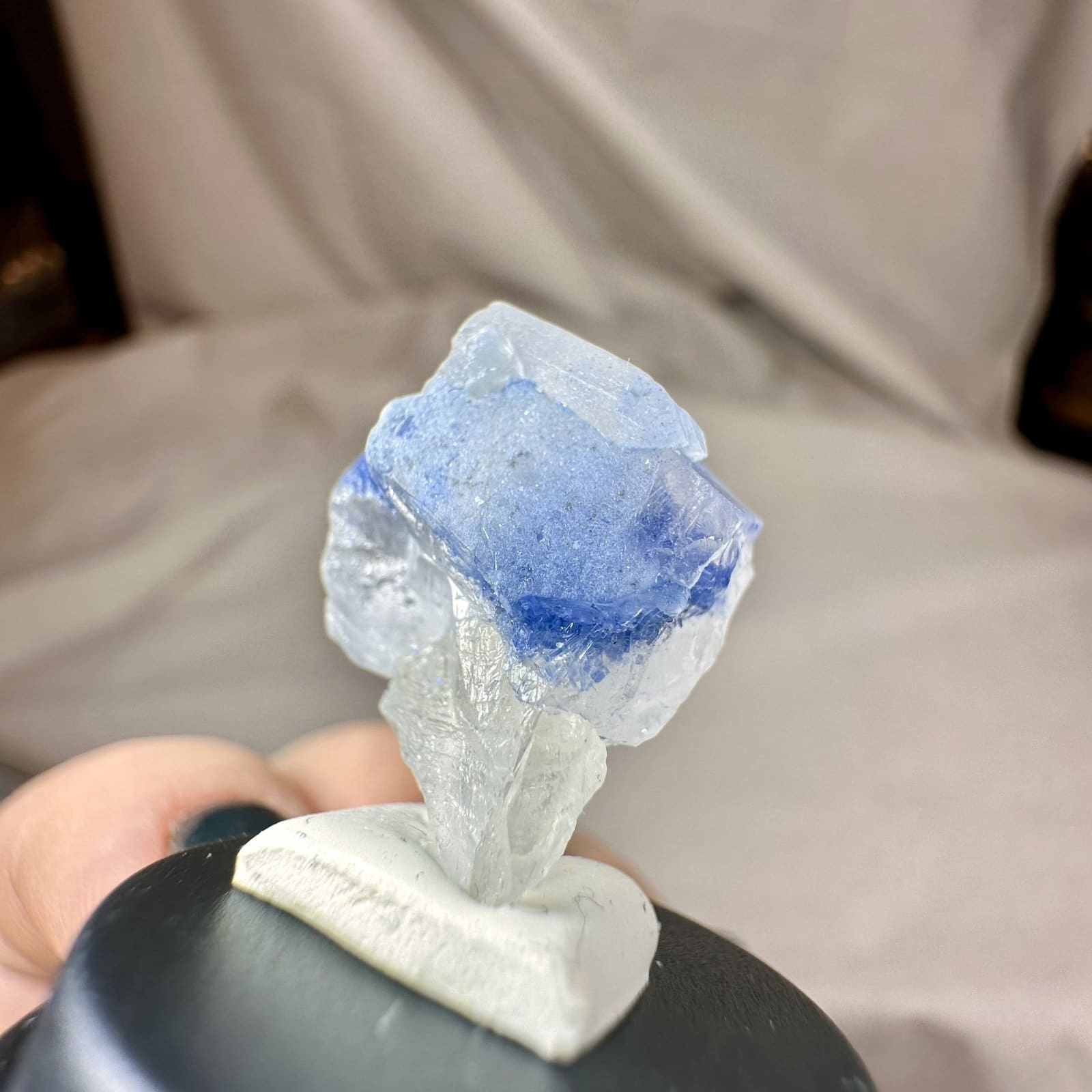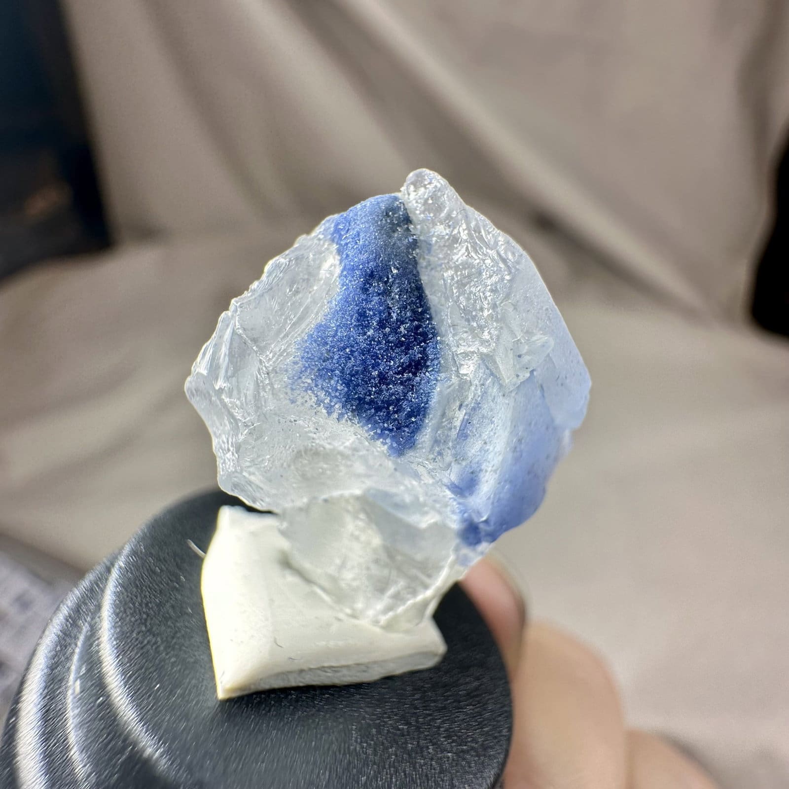 Deze naald dumortiriet in kwarts uit Bahia in Brazilië is een prachtig voorbeeld van hoe twee mineralen samen iets heel bijzonders kunnen vormen. In helder tot melkachtig kwarts lopen fijne naalden van diepblauwe dumortiriet, soms als losse vezels en soms als compacte bundels. Het contrast tussen het frisse blauw en het lichte kwarts maakt elk stuk direct herkenbaar.