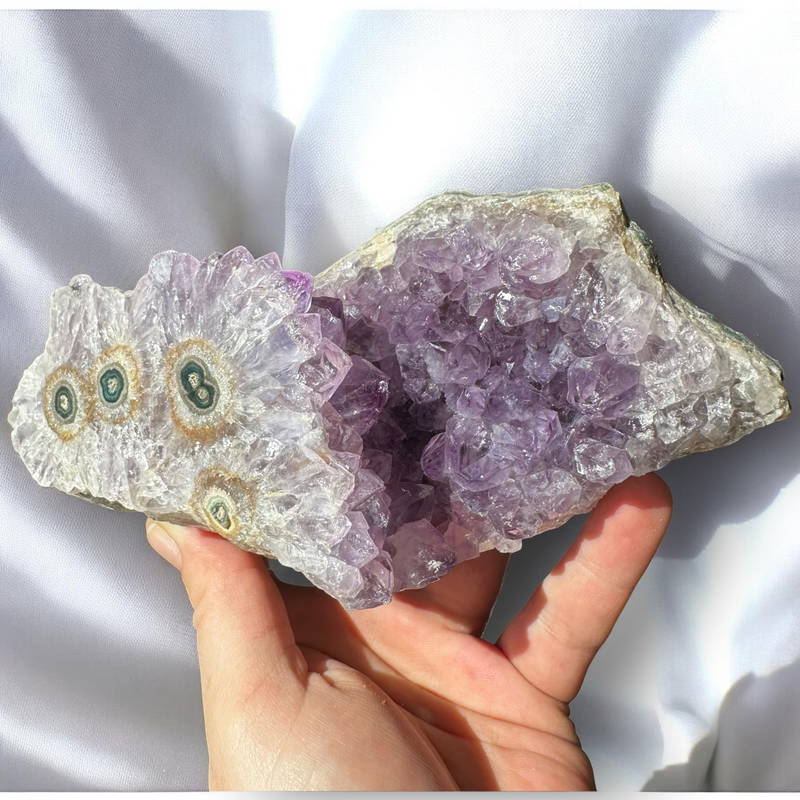Prachtige unieke amethist formatie uit Brazilië. Amethist “ogen” zijn stalactieten die perfect zijn gepolijst. Je ontvangt exact het stuk dat is afgebeeld op de foto’s.