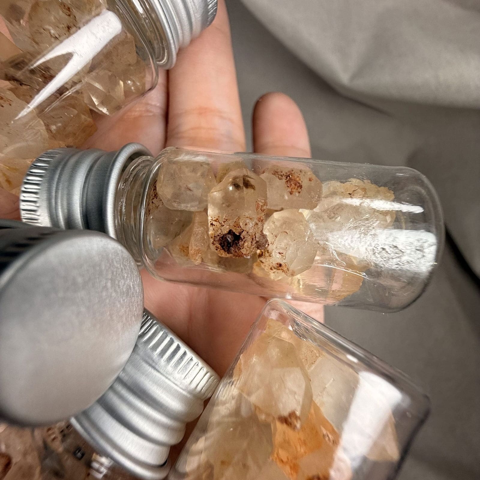 Leuke flesjes met petroleum kwarts kristallen. De petroleum geeft een magisch effect onder UV licht. De prijs is per stukÂ