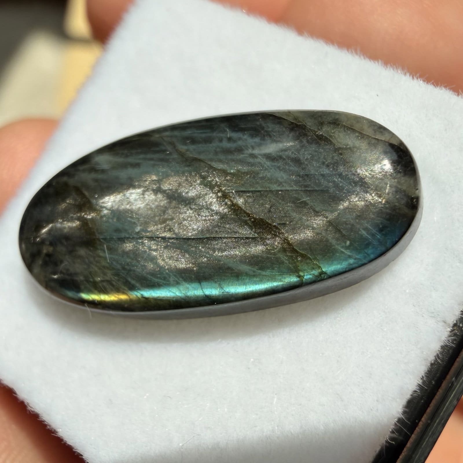 Hoge kwaliteit spectroliet cabochon in vensterdoosje. Zeer geschikt als cabochon om bijvoorbeeld sieraden te maken, maar ook los als verzamelstuk ontzettend leuk. Je ontvangt het exacte stuk zoals afgebeeld op de foto’s