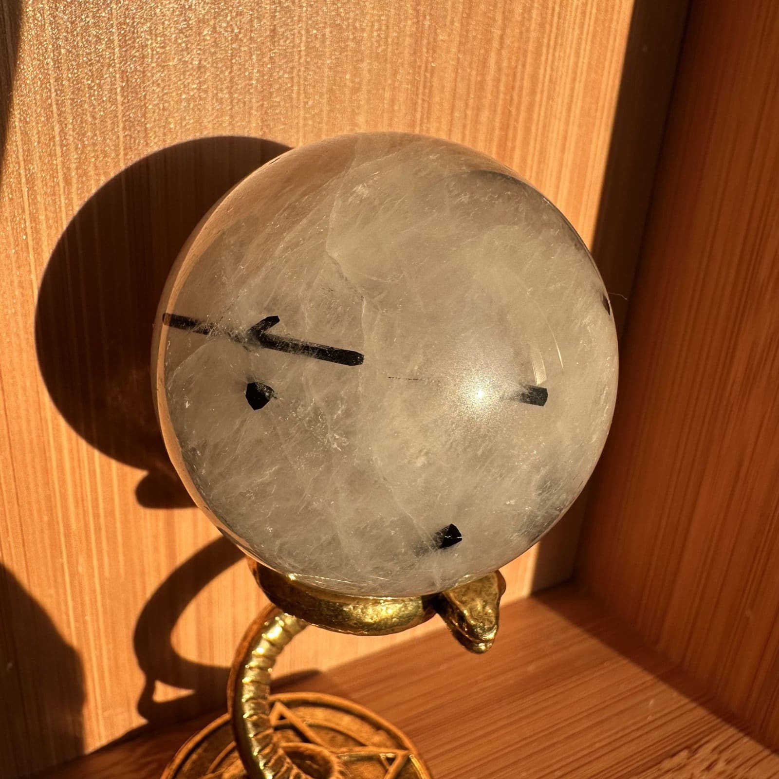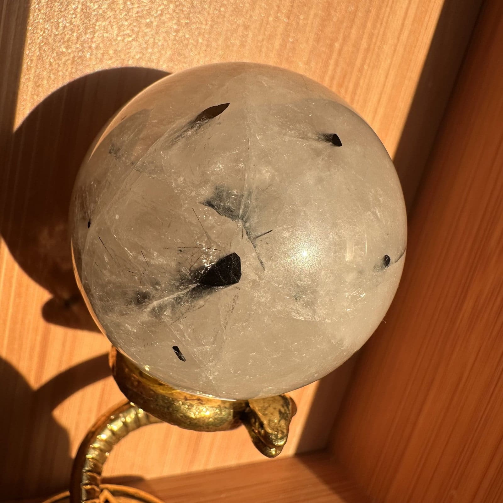 Deze toermalijnkwarts bollen komen uit Brazilië en bestaan uit helder tot melkachtig kwarts met natuurlijke insluitsels van zwarte toermalijn. De fijne tot soms krachtige naaldvormige kristallen lopen dwars door het kwarts heen en zorgen voor een sterk grafisch en contrastrijk uiterlijk.