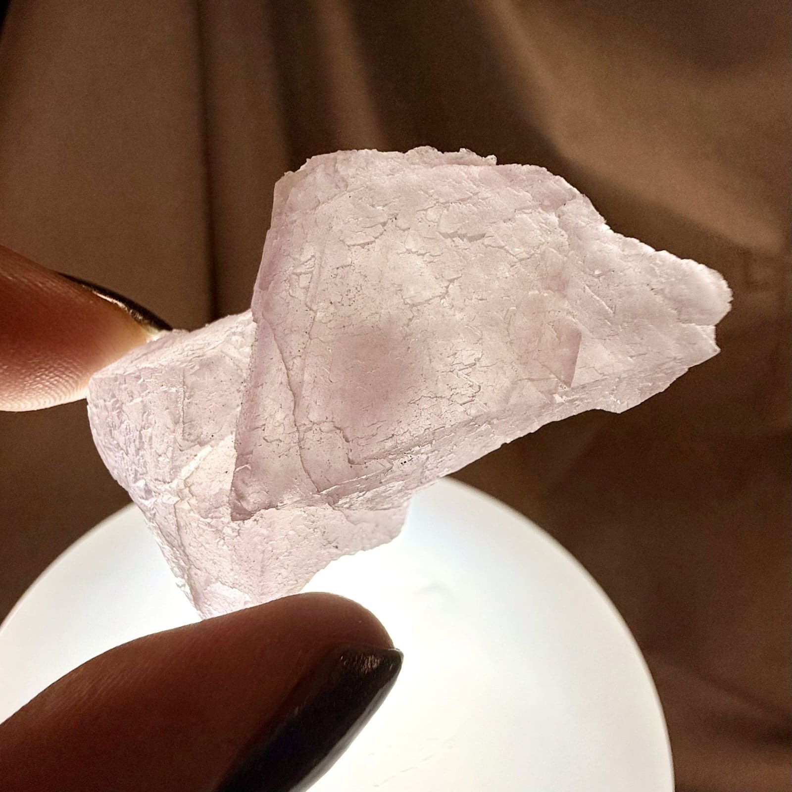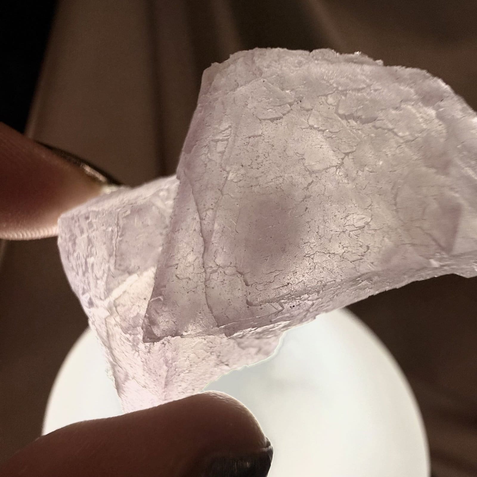 Prachtige lavendel fluoriet uit Zhejiang, China. De meeste stukken zijn gefotografeerd op een lamp om de transparantie goed te laten zien. Je ontvangt exact het stuk zoals afgebeeld op de foto’s.Â