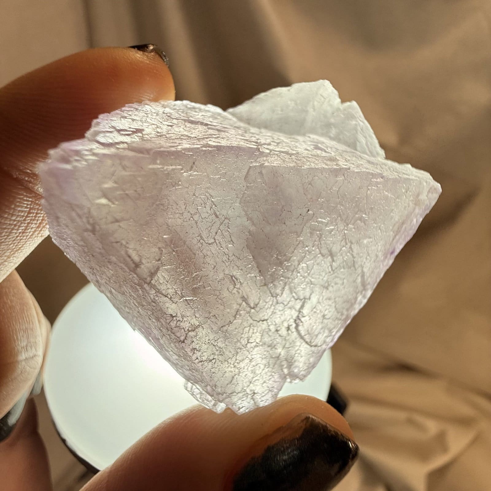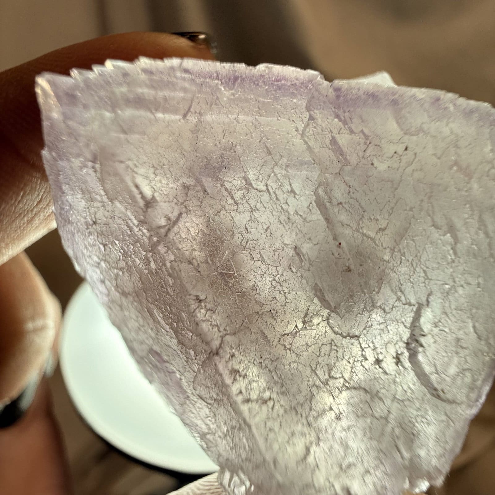 Prachtige lavendel fluoriet uit Zhejiang, China. De meeste stukken zijn gefotografeerd op een lamp om de transparantie goed te laten zien. Je ontvangt exact het stuk zoals afgebeeld op de foto’s.Â