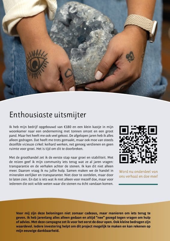 Maar om verder te groeien, met meer stabiliteit, eerlijkere handel en ruimte om mijn verhaal echt te delen, is het tijd voor de volgende stap: een eigen groothandel.
